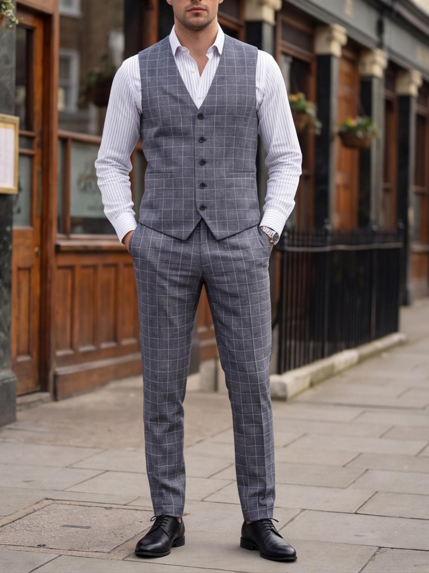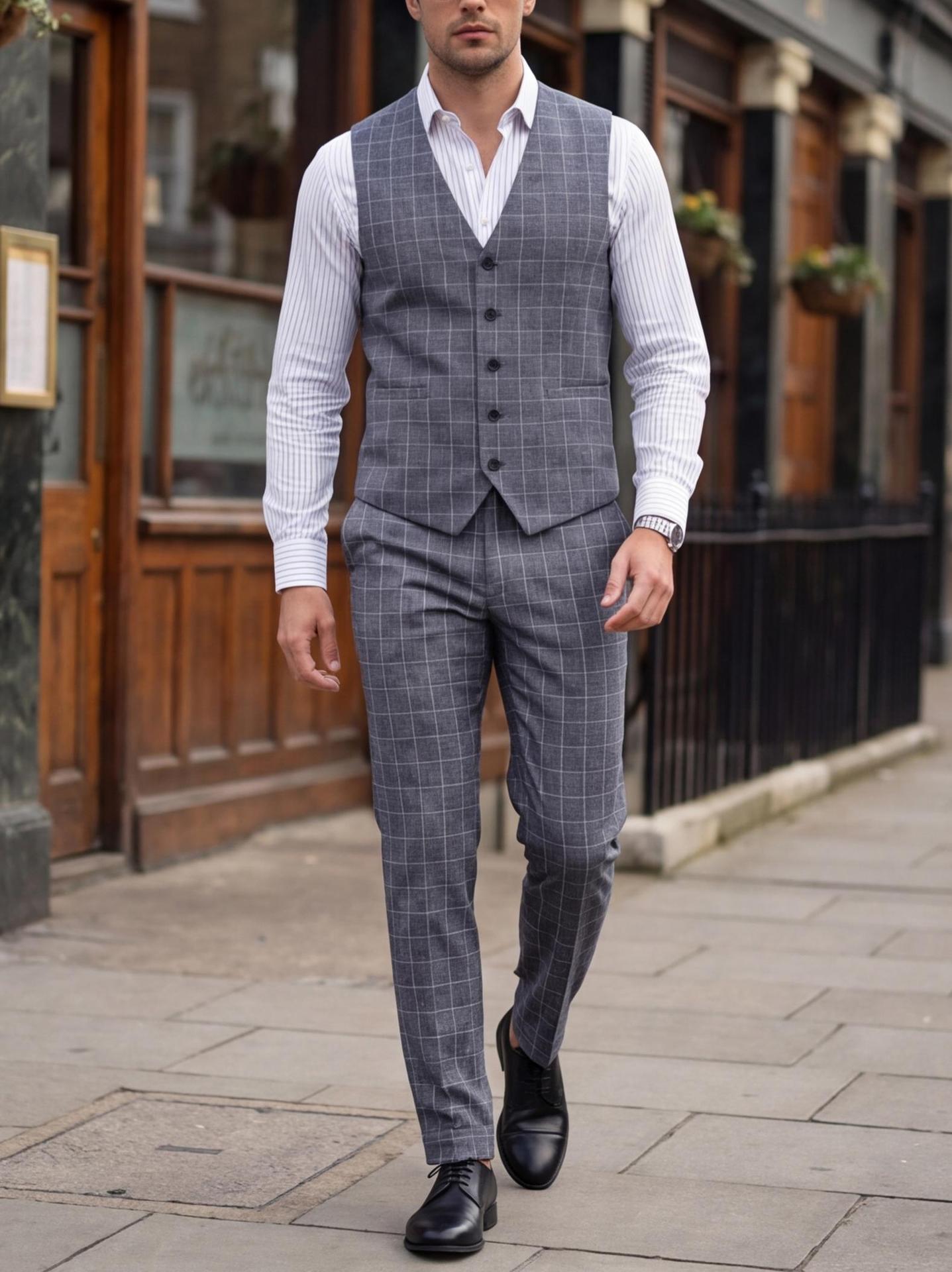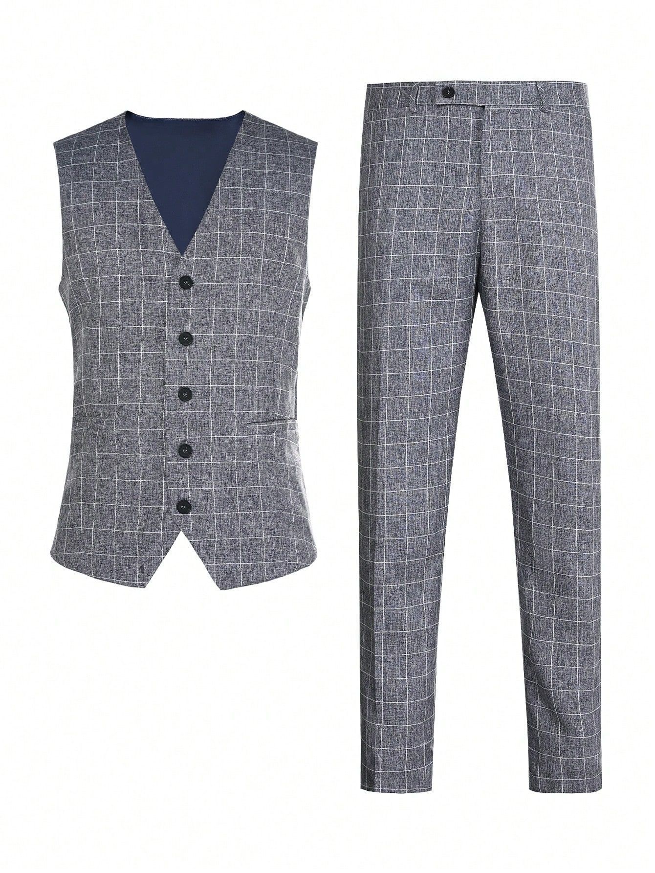Mens Light Business Plaid Waistcoat And Dress Pants Two-Piece Suit
