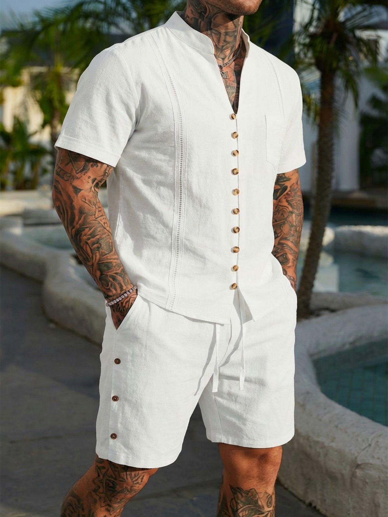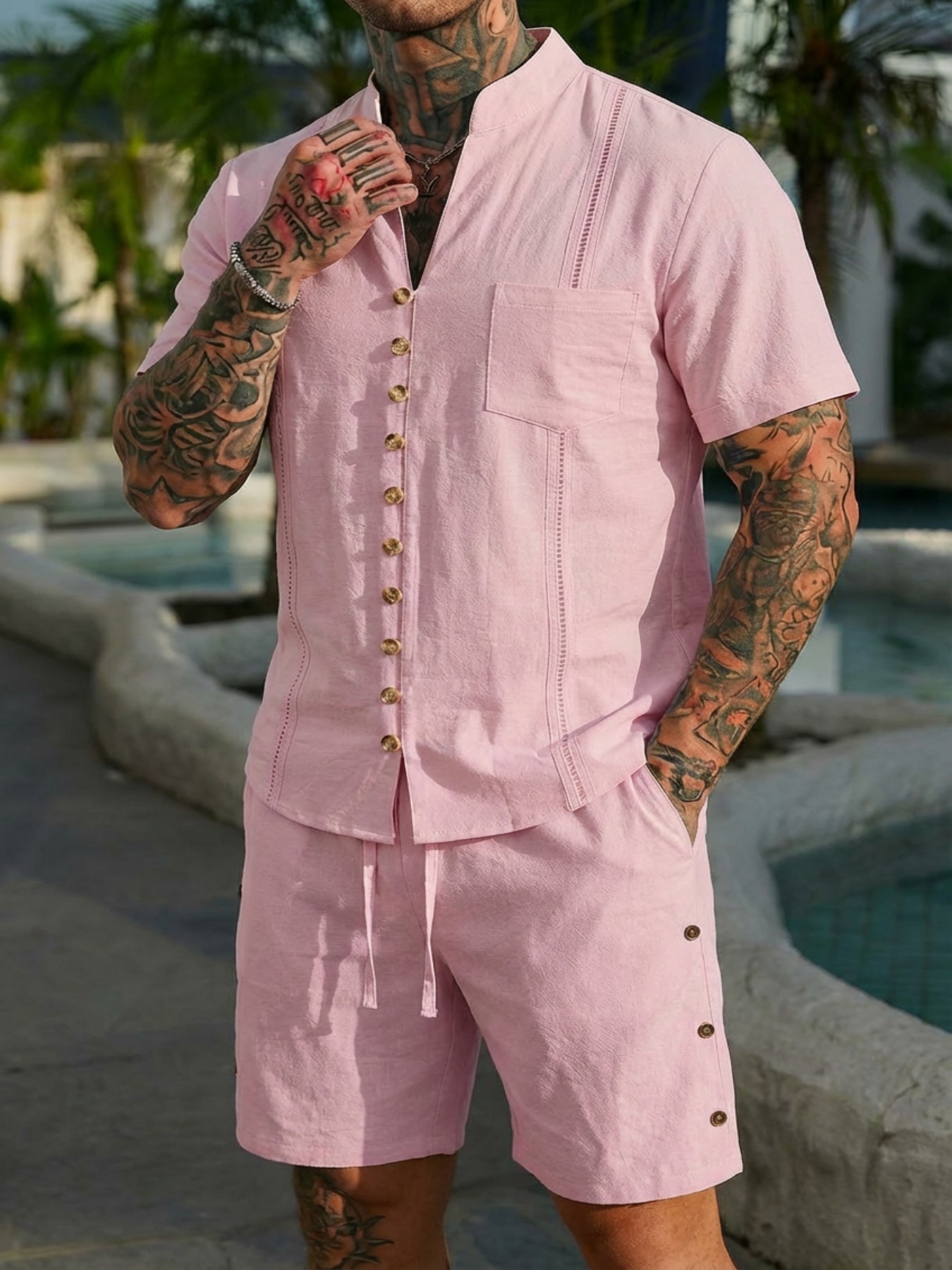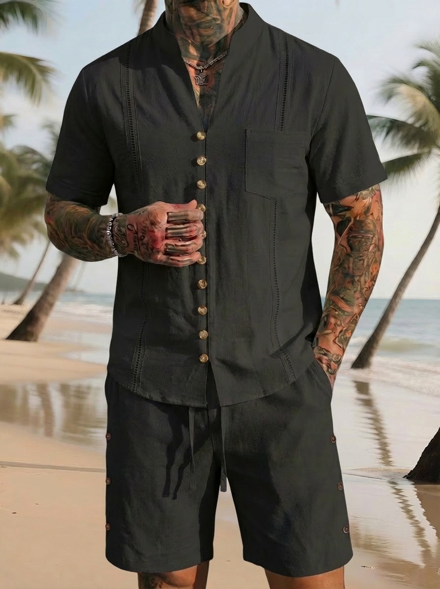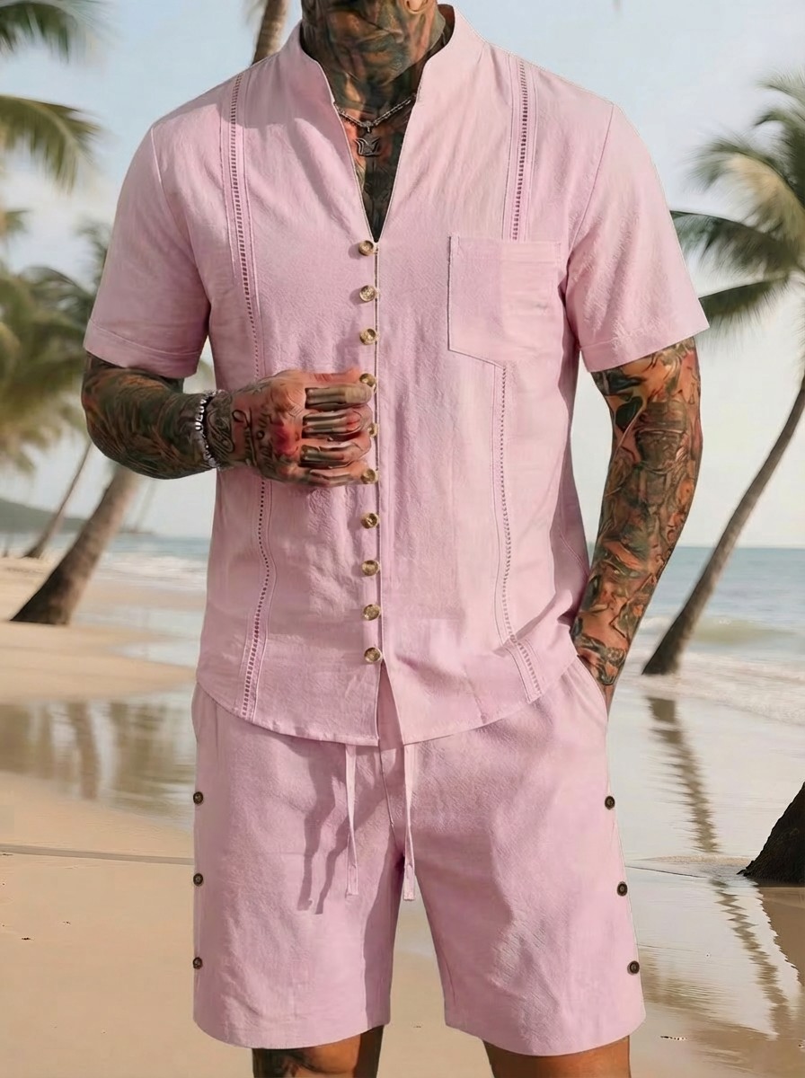 Stand-collar Solid-color Short-sleeve Shirt Set