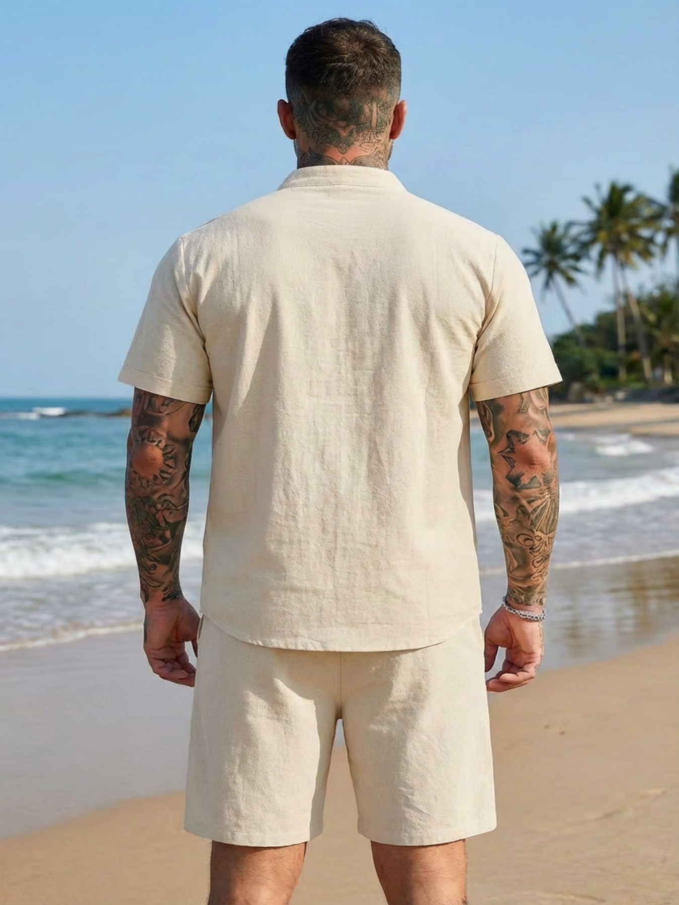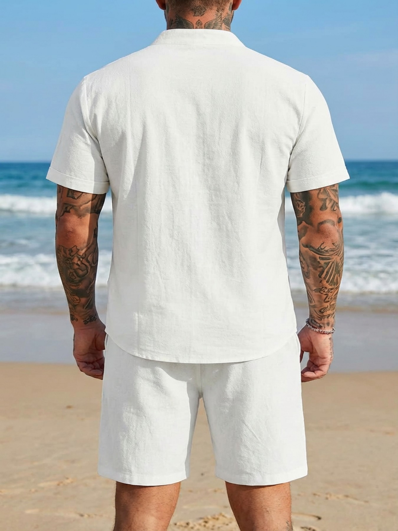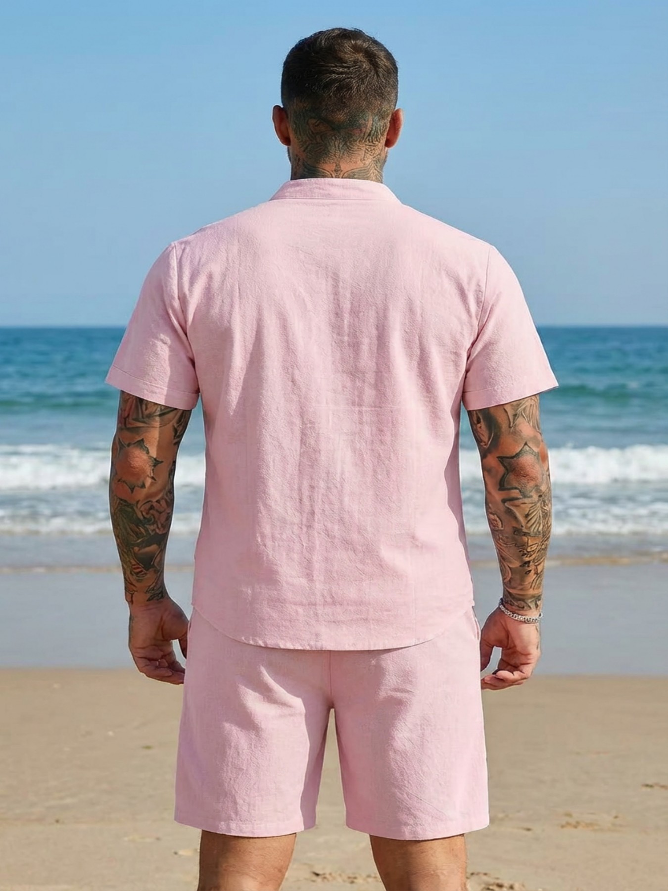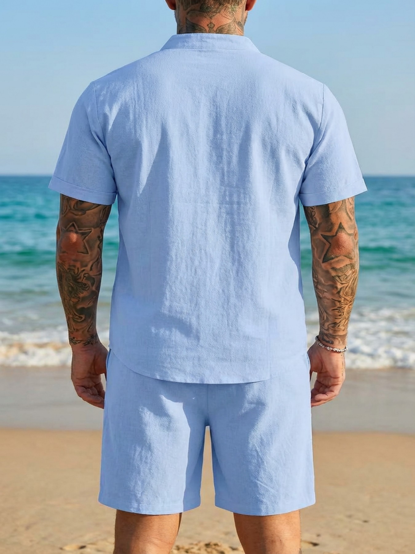 Stand-collar Solid-color Short-sleeve Shirt Set